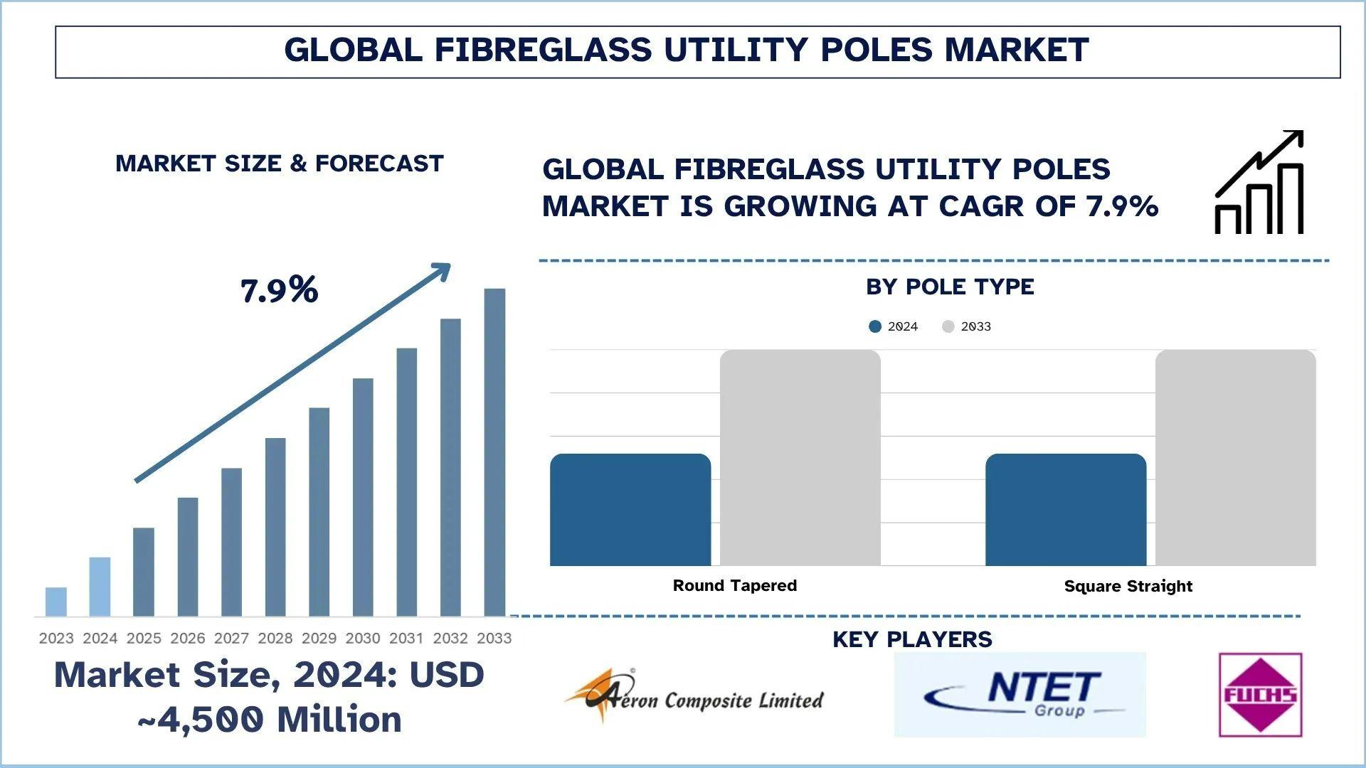 According to the UnivDatos, the rising demand for replacing power lines and poles would fuel the demand for the Fibreglass Utility Poles market. As per their “Fibreglass Utility Poles Market” report, the global market was valued at USD 4,500 million in 2024, growing at a CAGR of about 7.9% during the forecast period from 2025 - 2033 to reach USD million by 2033.