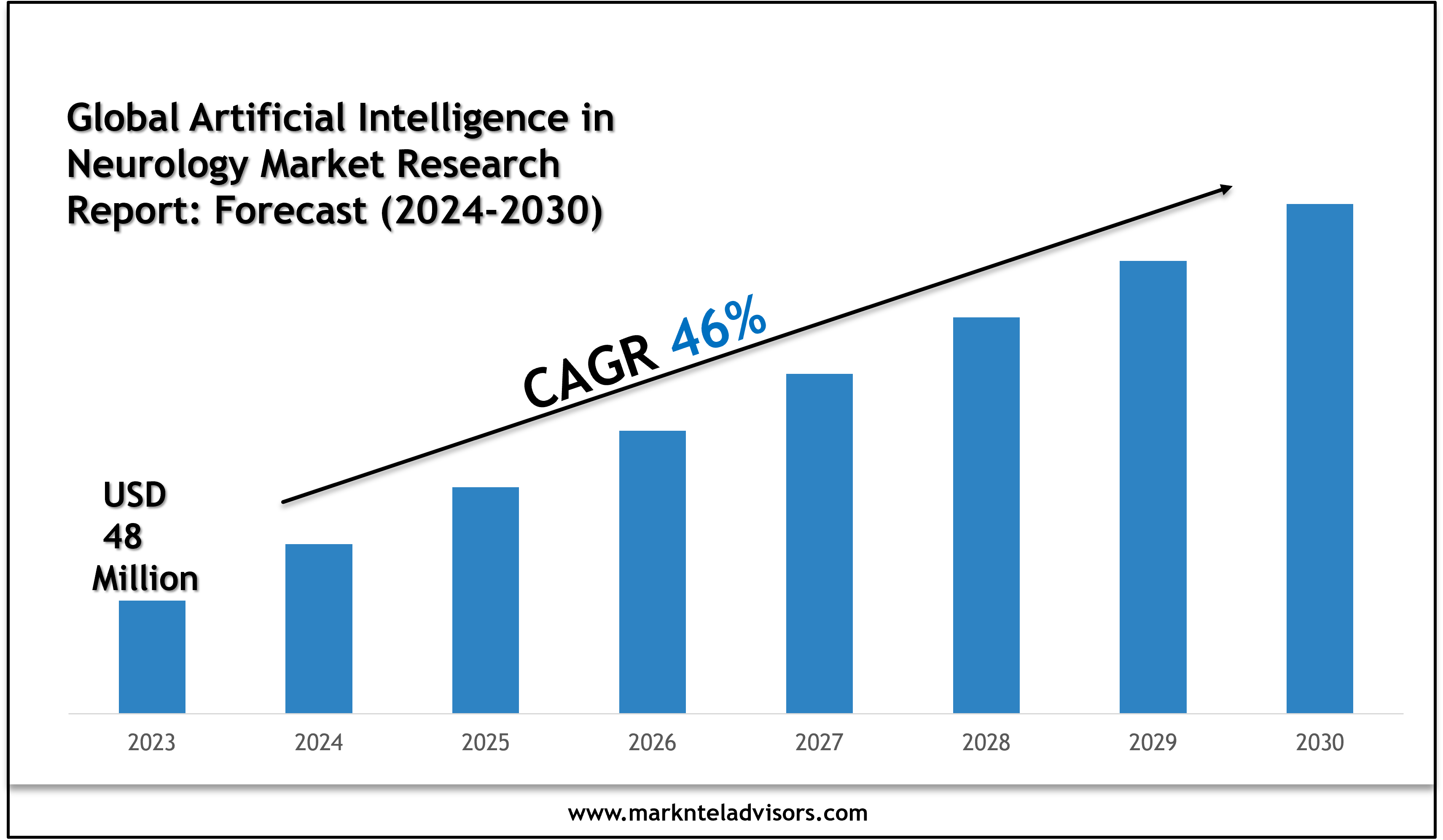 The Global Artificial Intelligence in Neurology Market is valued at around USD 48 million in 2023 and is estimated to grow at a CAGR of about 46% during the forecast period, i.e., 2024-30. The market is driven primarily by the growing complexities in making clinical decisions, difficulties in surgeries while distinguishing tumor tissues from healthy ones, rapidly expanding Healthcare Information Technology (HCIT), and the mounting inclination toward patient-centric care. The burgeoning demand for cost-effective, fast & accurate diagnoses, rapid generation of diagnostic data, and efficient report analysis is another crucial aspect likely to drive the market in the coming years.