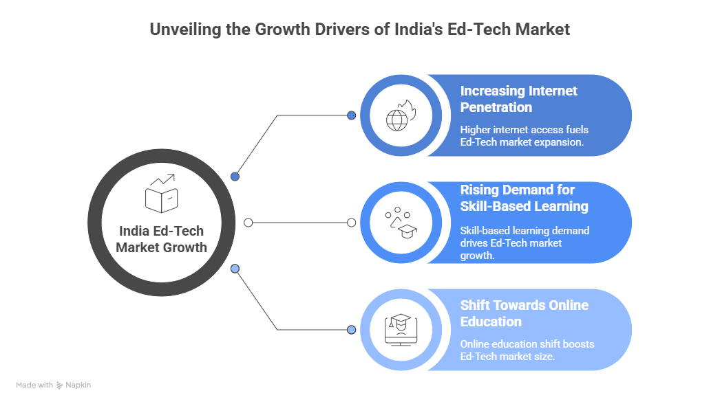 Growth drivers include increasing internet penetration, the demand for flexible learning options, government initiatives promoting digital education, and a growing emphasis on upskilling and reskilling.