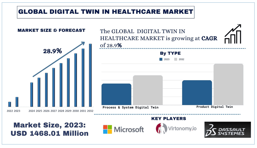 The Digital Twin in Healthcare Market was valued at USD 1468.01 Million and is expected to grow at a strong CAGR of around 28.9% during the forecast period (2024-2032) owing to investment in the digital twin.