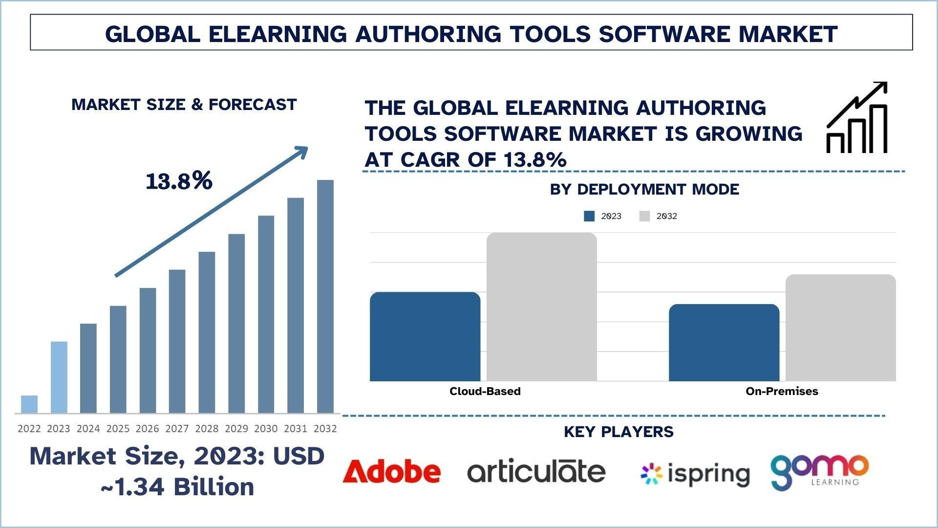 According to the UnivDatos, the increased adoption of digital learning, growing remote workforce, rising investments in EdTech, and increasing mobile device penetration fuels demand for responsive eLearning content and drive the eLearning Authoring Tools Software market. As per their “ELearning Authoring Tools Software Market” report, the global market was valued at USD 1.34 Billion in 2023, growing at a CAGR of about 13.8% during the forecast period from 2024 - 2032 to reach USD Billion by 2032.