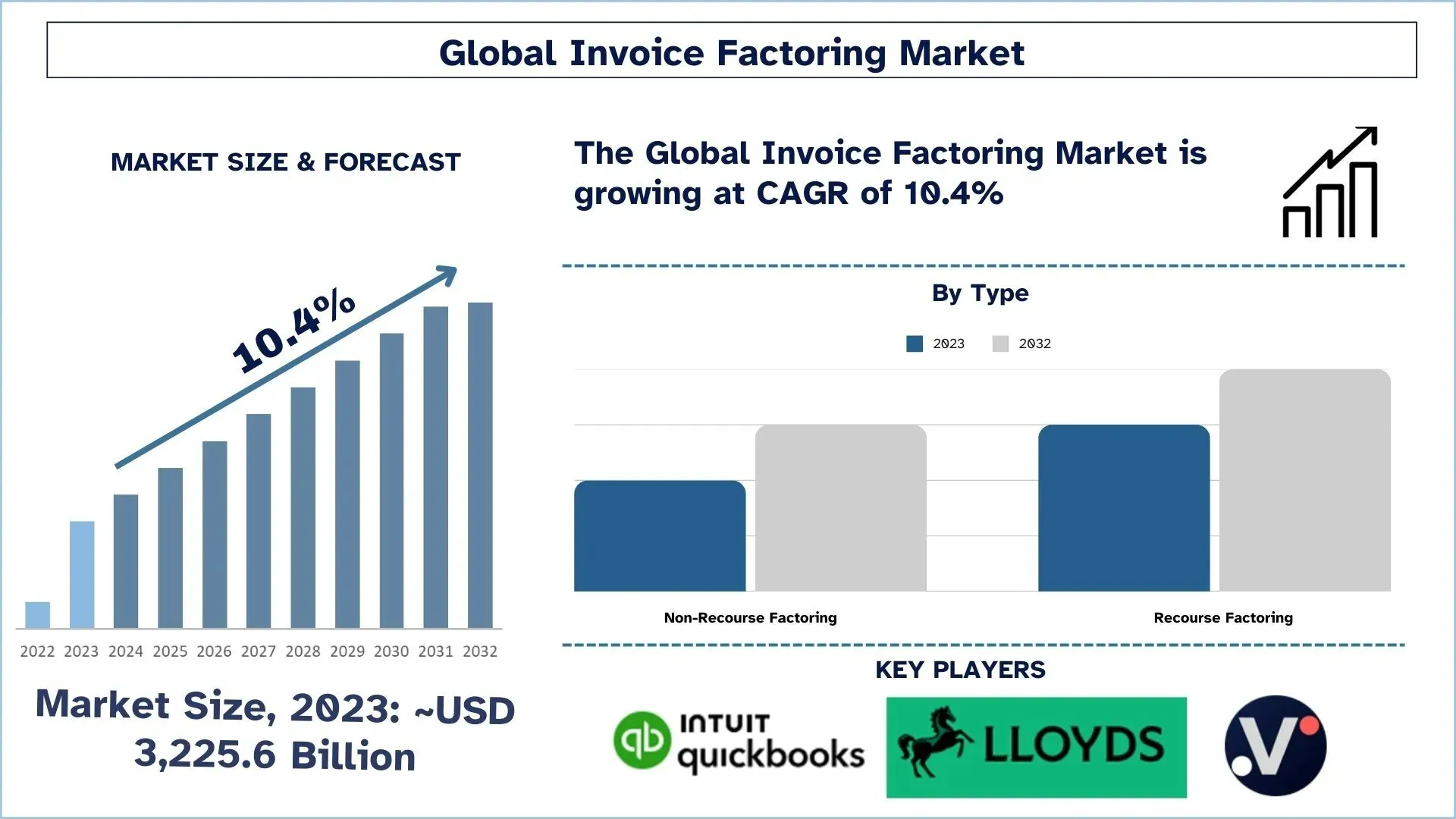 The Global Invoice Factoring Market was valued at USD 3,225.6 Billion in 2023 and is expected to grow at a strong CAGR of around 10.4% during the forecast period (2024-2032) owing to the increased cross-border transactions that require flexible financing solutions, boosting the invoice factoring market.