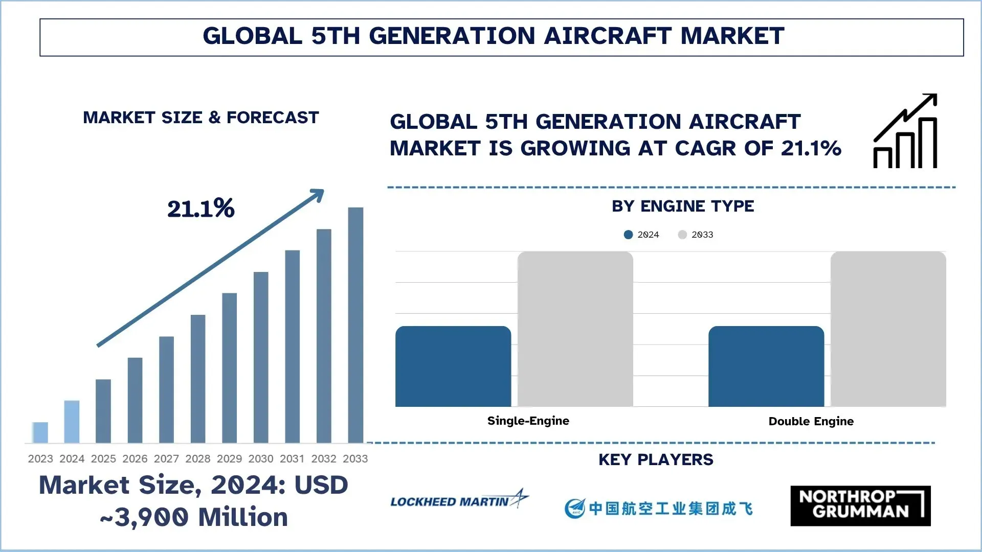 The Global 5th Generation Aircraft Market was valued at USD 3,900 million in 2024 and is expected to grow to a strong CAGR of around 21.1% during the forecast period (2025-2033F), owing to the rising demand for stealth jets.