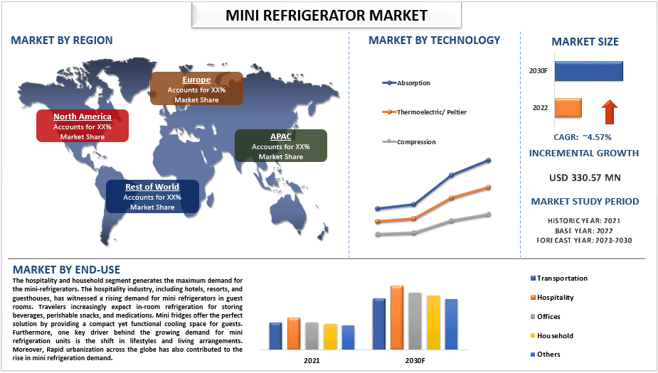 According to the Universal Data Solutions analysis, the rising general population income and growing migration of people towards urban cities will drive the scenario of Mini Refrigerators and as per their “Mini Refrigerators Market” report, the market was valued at USD 330.57 Million in 2022 and expected to grow at CAGR of 4.57% during the forecast period from 2023 - 2030 to reach around USD 470 Million by 2030.