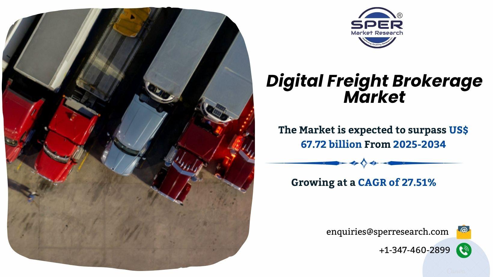 According to SPER market research, ‘Global Digital Freight Brokerage Market Size- By Transportation Mode, By Service Type, By Customer Type, By End-User Industry - Regional Outlook, Competitive Strategies and Segment Forecast to 2034’ state that the Global Digital Freight Brokerage Market is predicted to reach 67.72 billion by 2034 with a CAGR of 27.51%.