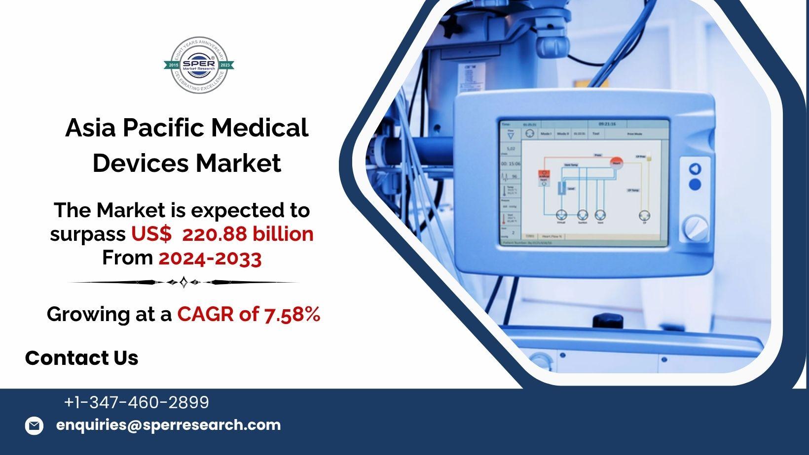 According to SPER market research, ‘Asia Pacific Medical Devices Market Size- By Type, By End User- Regional Outlook, Competitive Strategies and Segment Forecast to 2033’ states the Asia Pacific Medical Devices Market is estimated to reach USD 220.88 billion by 2033 with a CAGR of 7.58%.