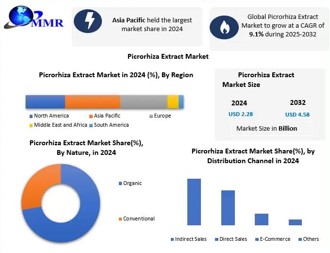 The Global Picrorhiza Extract Market, valued at USD 2.28 Bn in 2024, is projected to reach USD 4.58 Bn by 2032, growing at a CAGR of 9.1%.