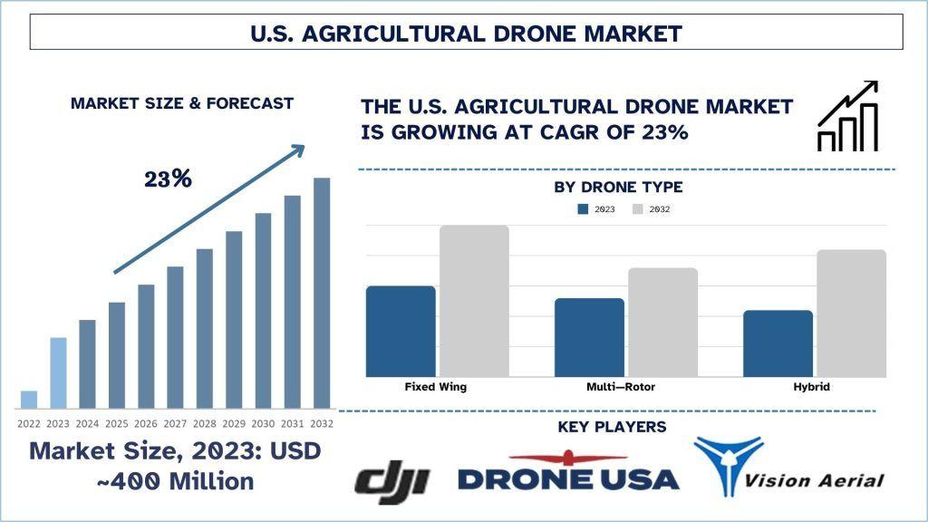 According to a new report by UnivDatos, the U.S. Agricultural Drone Market was valued at USD 400 million in 2023 and is expected to grow at a CAGR of 23% during the forecast period (2024-2032). Agricultural drones have in the recent past been the most radical development in the farming industry in the United States in terms of response to challenges of farming as well as resources used in farming. These UAVs are now revolutionizing farming practices, crop management, yield, and of course, cost control. With a continuously increasing number of farmers and producers requiring precision agriculture, the use of agricultural drones in the United States is on the rise and has lately featured prominently in the media for the likelihood of promoting sustainability and efficiency.