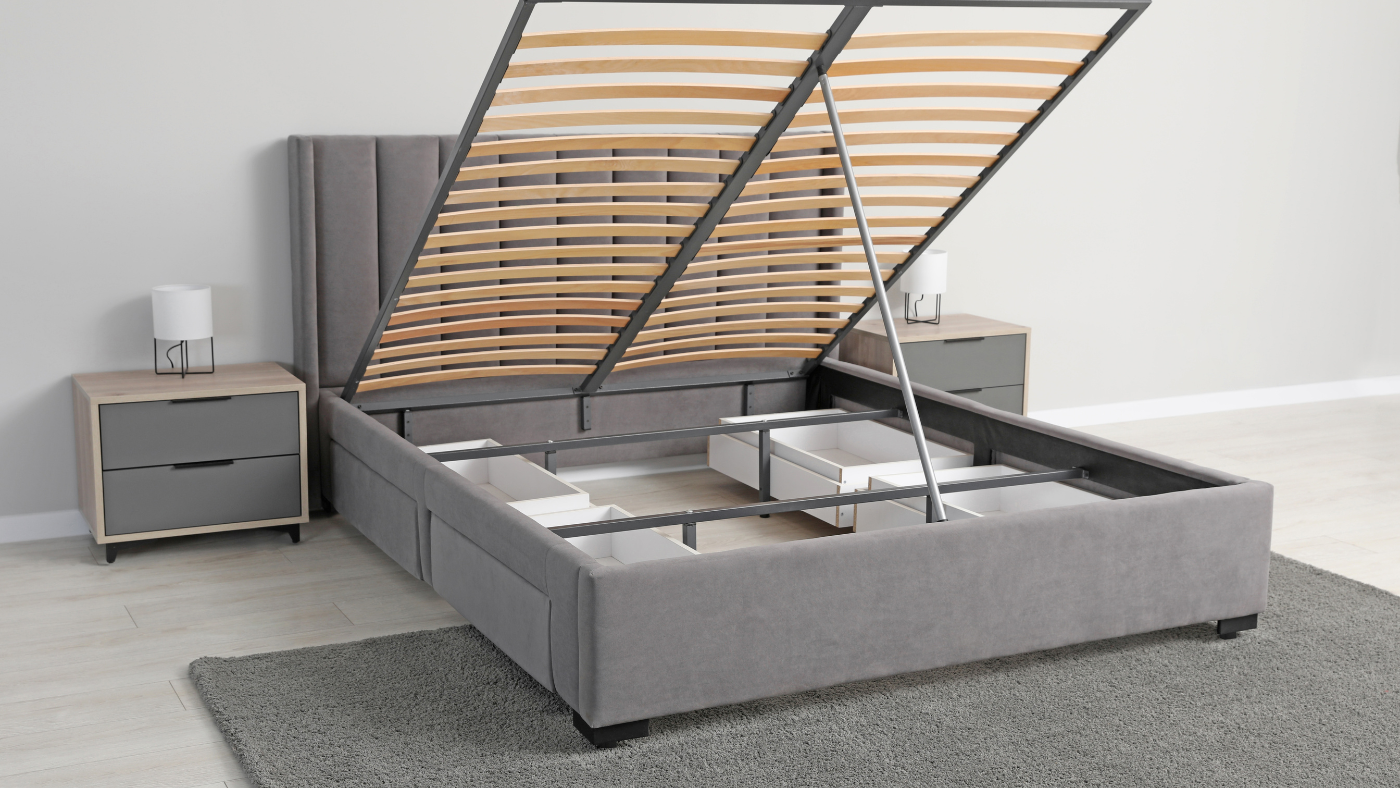 Definition: integrated drawers or open shelves built into the headboard. Examples: narrow drawers for controllers and books, pull-out trays for a laptop. Benefit: *effortless bedside storage without extra furniture.*