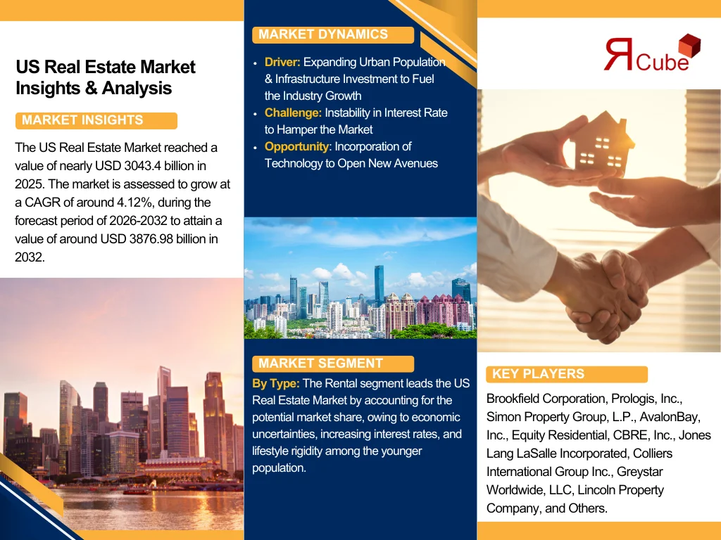 The US Real Estate Market reached a value of nearly USD 3043.4 billion in 2025. The market is assessed to grow at a CAGR of around 4.12%, during the forecast period of 2026-2032 to attain a value of around USD 3876.98 billion in 2032. The national industry is foreseen to experience substantial growth in the upcoming years, in line with the shifting customer preferences, favorable government guidelines, and elevated infrastructure spending.